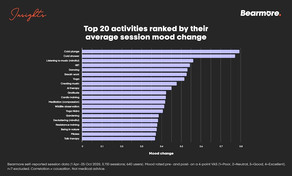 Short blasts of cold (1–4 minutes) delivered the highest "mood-per-minute" return of any activity.