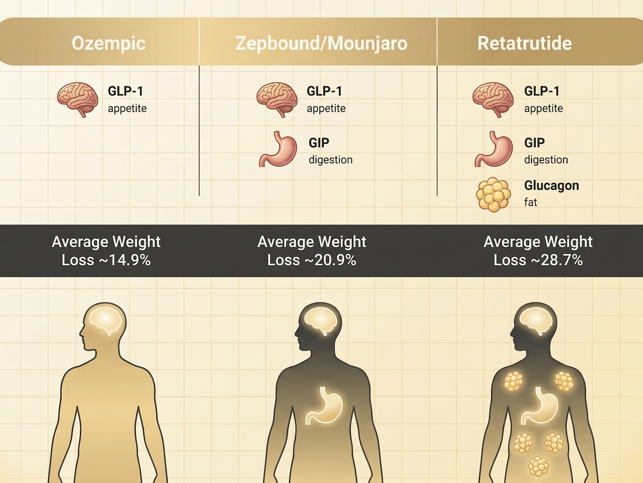 The Triple Threat: Retatrutide targets three (GLP-1 + GIP + Glucagon).